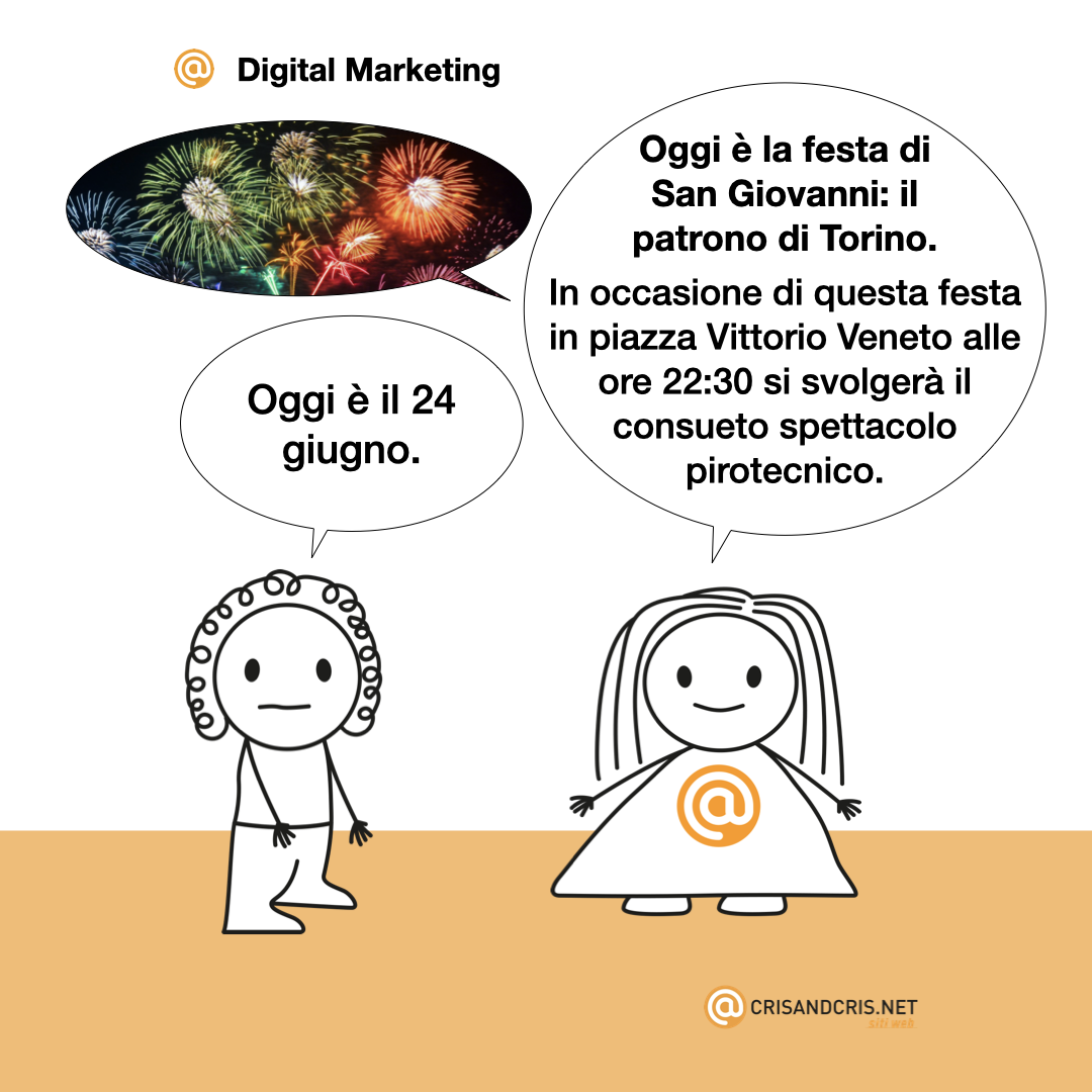 Digital marketing: Oggi รจ il 24 giugno. Oggi รจ la festa di San Giovanni: il patrono di Torino.In occasione di questa festa in piazza Vittorio Veneto alle ore 22:30 si svolgerร il consueto spettacolo pirotecnico.